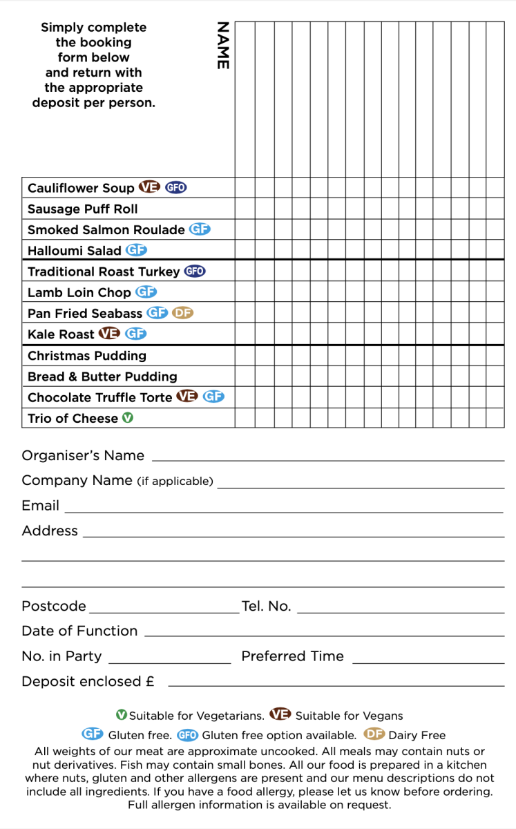 A deposit of £20 per person will be required at the time of booking. A pre-order will be required by Thursday 18th December.