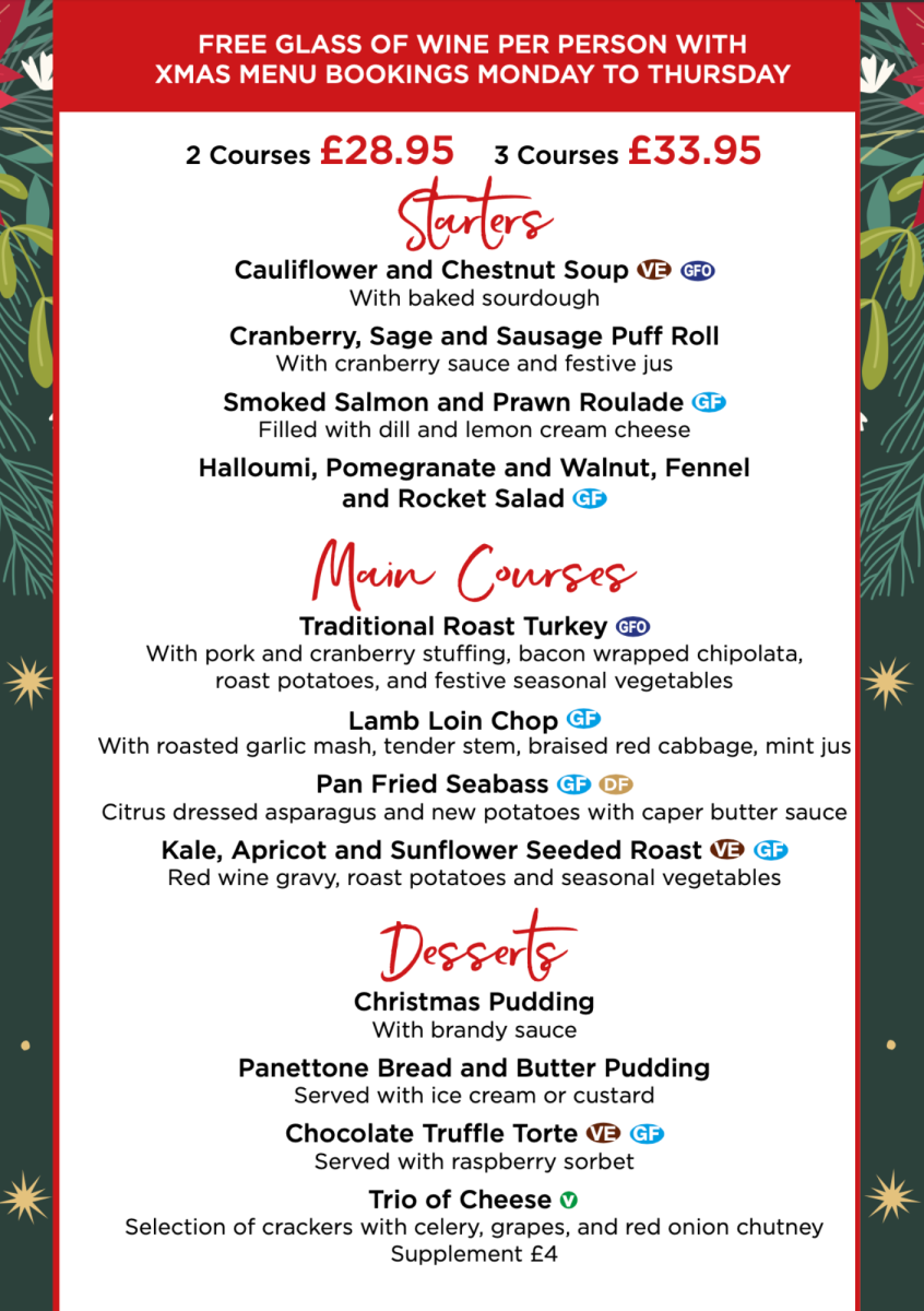 A pre order and a deposit will be required for all festive menu bookings. The Festive Menu will only be available Monday - Saturday each week.